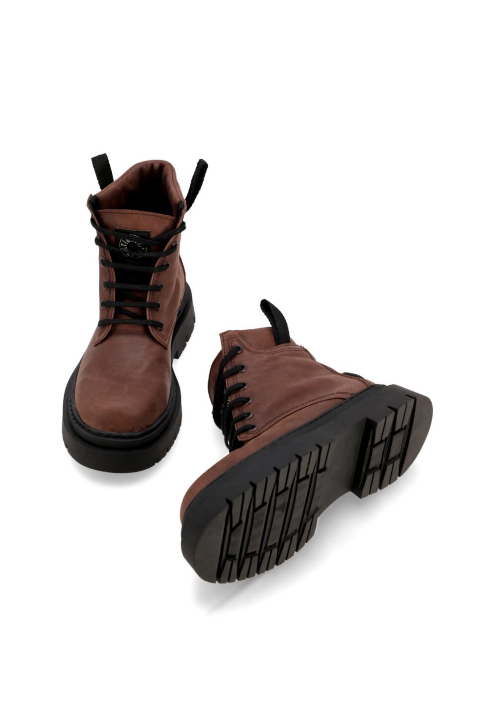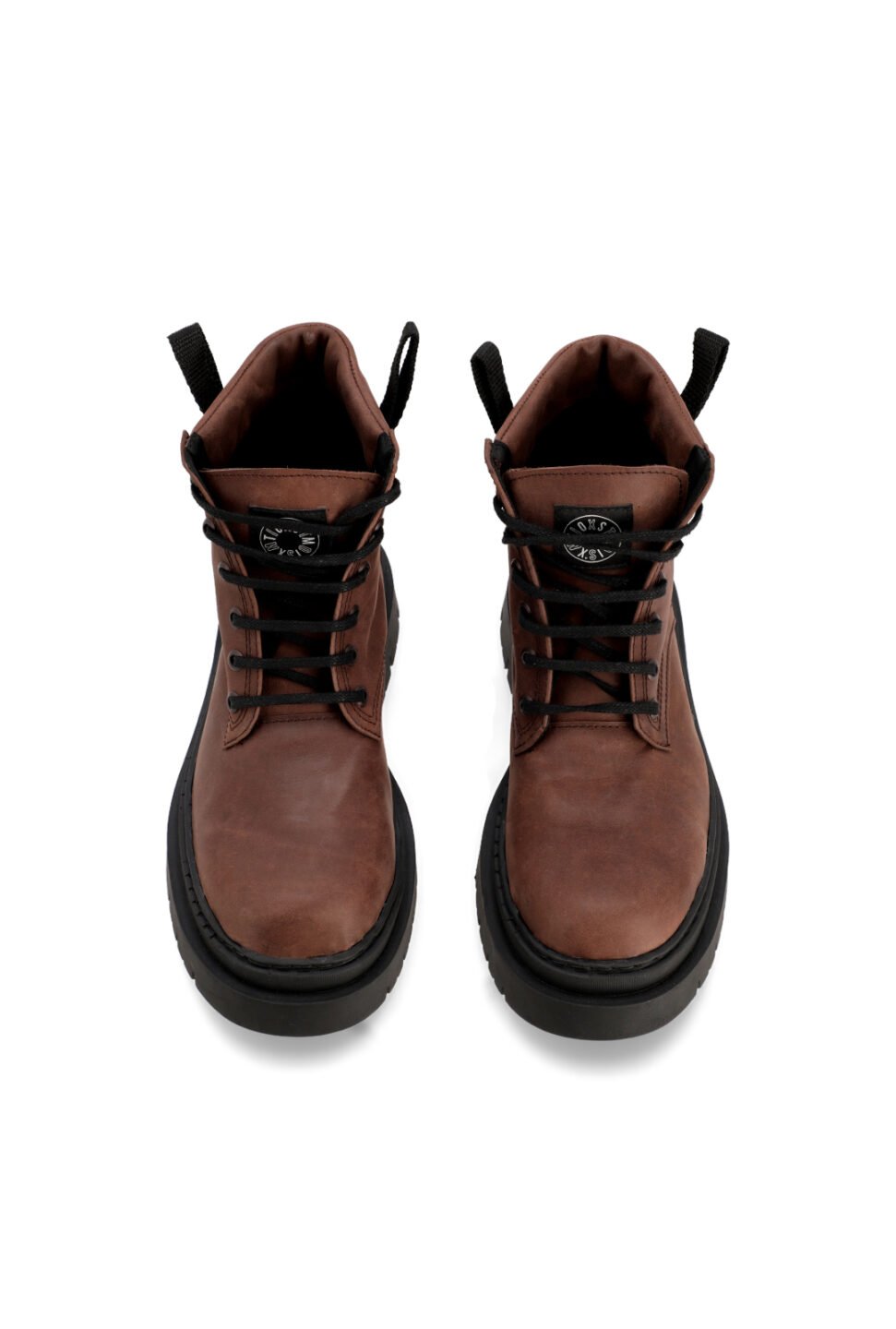Bota acordonada de caña media realizada en cuero nobuck color marron. Su base es ancha y con un poco de altura. Posee en la parte alta de la caña una terminación acolchada que le aporta especial comodidad. Para que el calce sea más accesible tiene 2 tiras que facilitan el acceso. El ajuste es con cordones encerados al tono. Capellada cosida a su base 360º para mayor durabilidad.