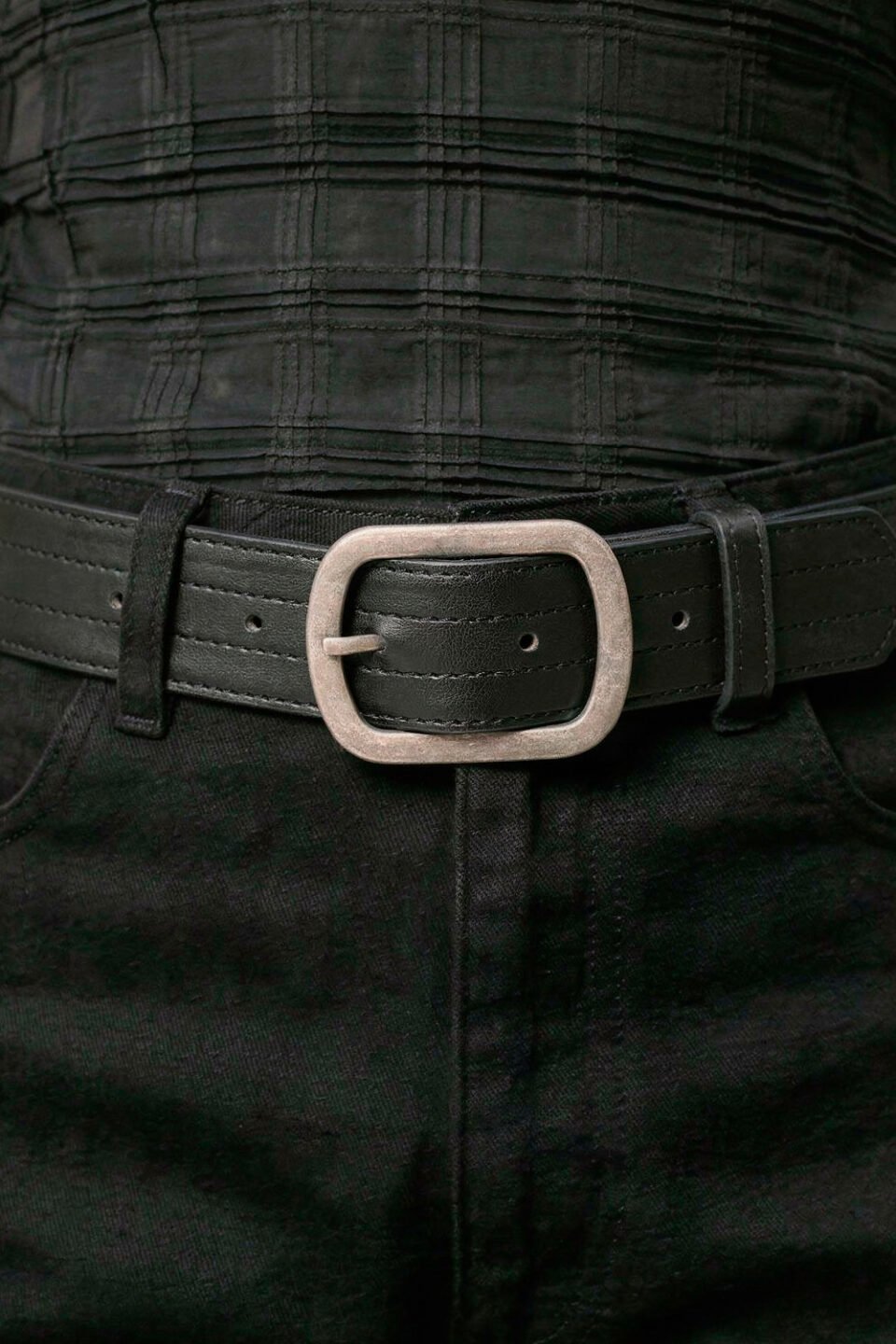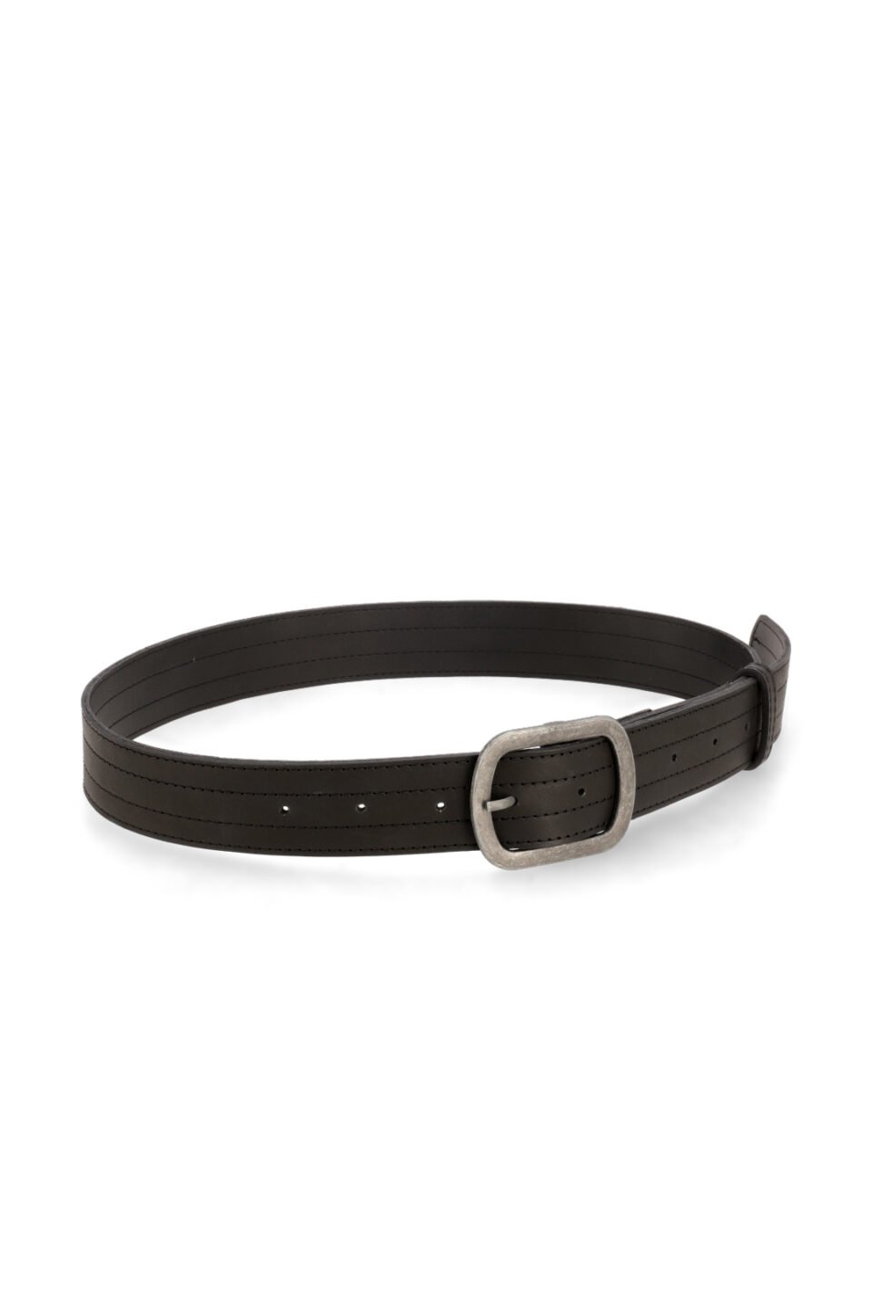 Cinto Frank de cuero opaco color negro con costuras marcadas . Hebilla color niquel avegentado.